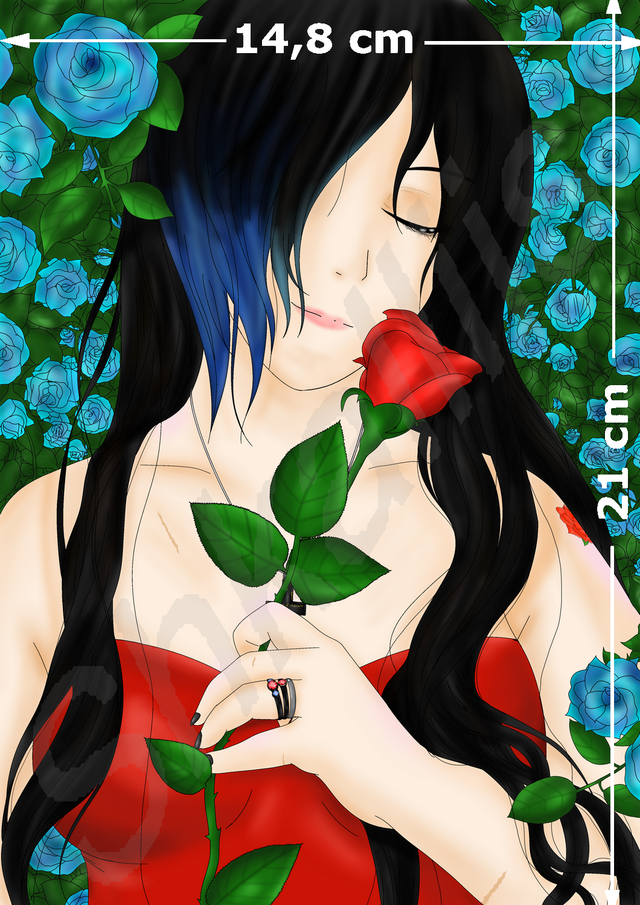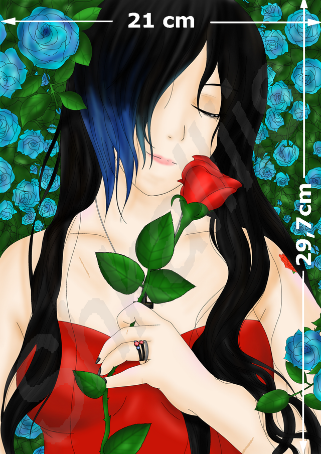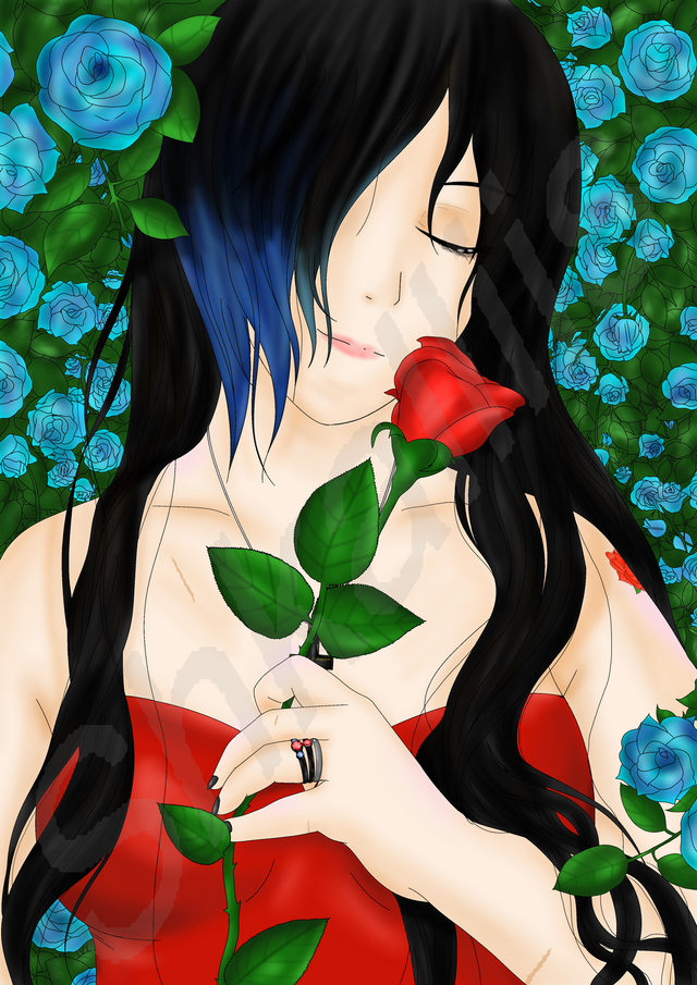 Illustration réalisée à la tablette graphique. Shkalliis, principale OC et persona, dans sa forme originelle, avec les roses bleues de son royaume et une rose rouge offerte par un être cher.